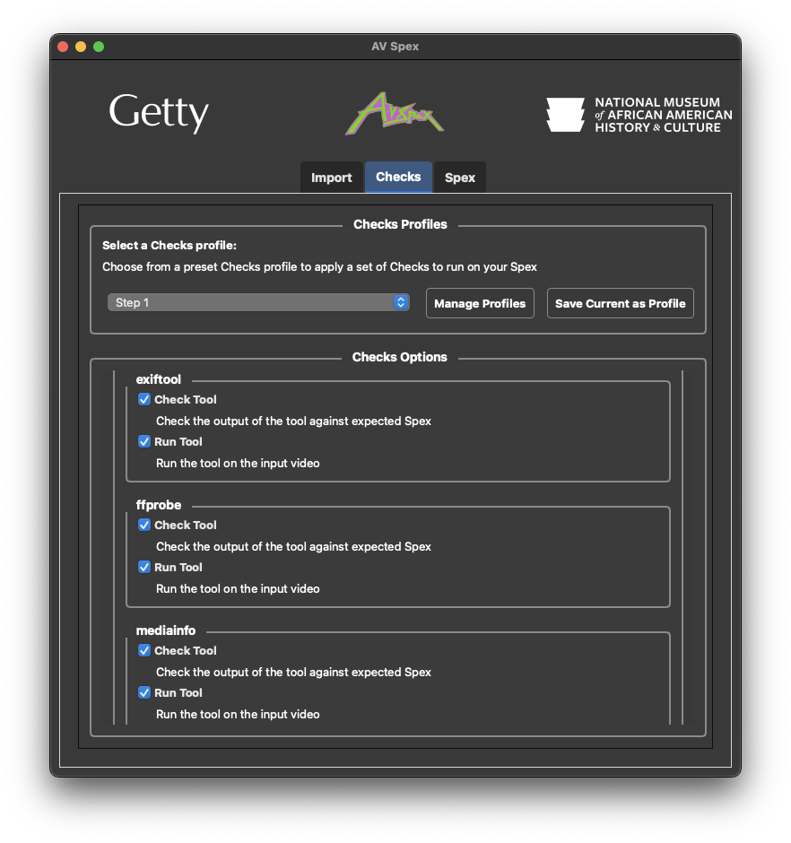 The “Check Tool” checkbox references the values in the “Spex” tab of the application. The Spex tab holds expected values for the different outputs. For a given metadata field in any of the previously mentioned metadata tools, the Spex tab can hold multiple “expected” values, if AV Spex finds the expected value, it considered it a pass, if it doesn’t it’s considered a fail.
