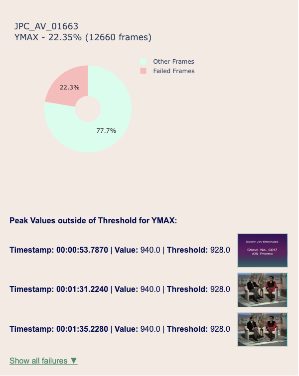 An excerpt from the AV Spex HTML report showing frames that are outside the thresholds set by the video’s color bars.