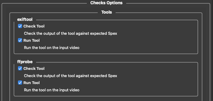Each tool in the Checks tab has two options, the “Check Tool” and “Run Tool” check boxes. The “Run Tool” option is straightforward enough, it runs the selected tool on the input media and creates a sidecar file, usually in json. All the sidecar files are stored in a subdirectory labeled with the input directory's name and the suffix “qc metadata.”