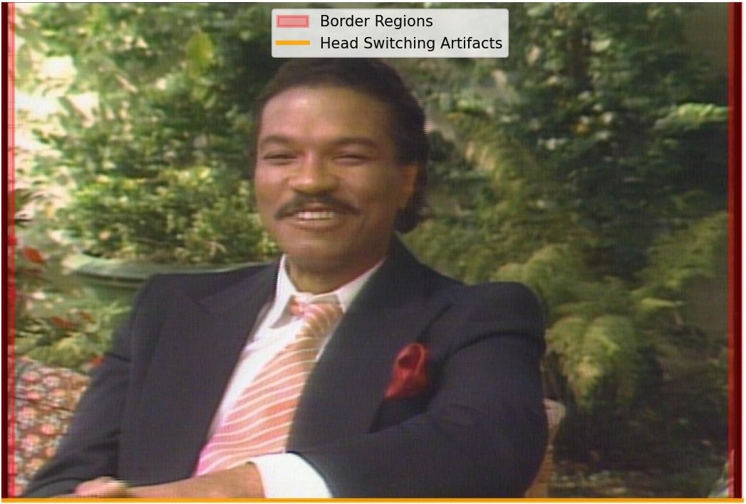 When I was using cyan highlights of pixels outside of broadcast range, this image of LL Cool J would consistently be flagged. The edges of the white shirt on the man to J’s left, and the pant legs of the interviewer (bottom left of the frame) are not highlighted by FFmpeg signalstats. But there is a turquoise halo around these objects caused by an analog video artifact (maybe chroma shift/smear). This frame in particular took me a long time to notice because parts of the white shirt are, in fact, outside of broadcast range and would also be highlighted.