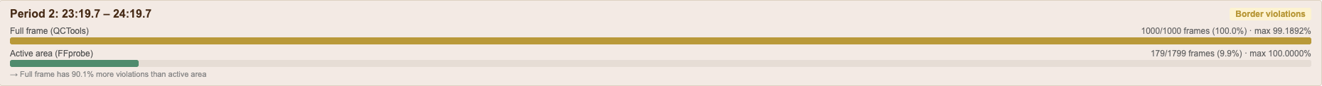 NMAAHC found that many of the videos in their collection had frames outside of broadcast range. But when the archivists at the museum took a closer look at the files they found that the frames simply contain parts of the blanking area (video content outside of the picture area). These black borders around the outside of the picture area contain “sub-blacks” or blacks outside of broadcast range. The borders are not an issue unto themselves, but they were preventing NMAAHC’s team from effectively using the QCTools reports to automate their checks.